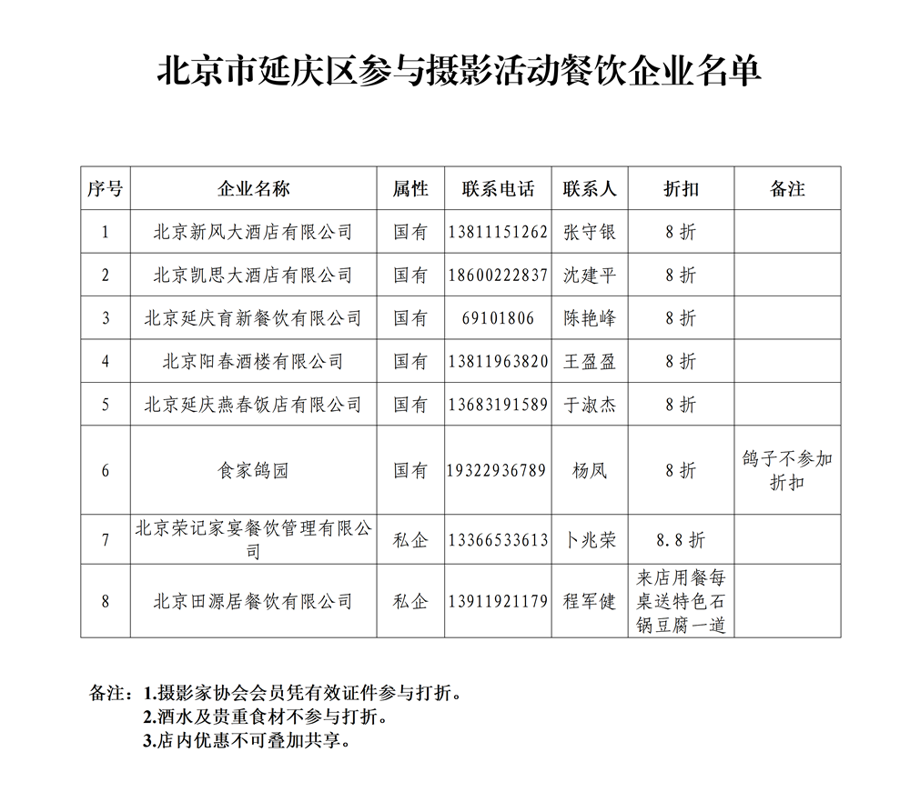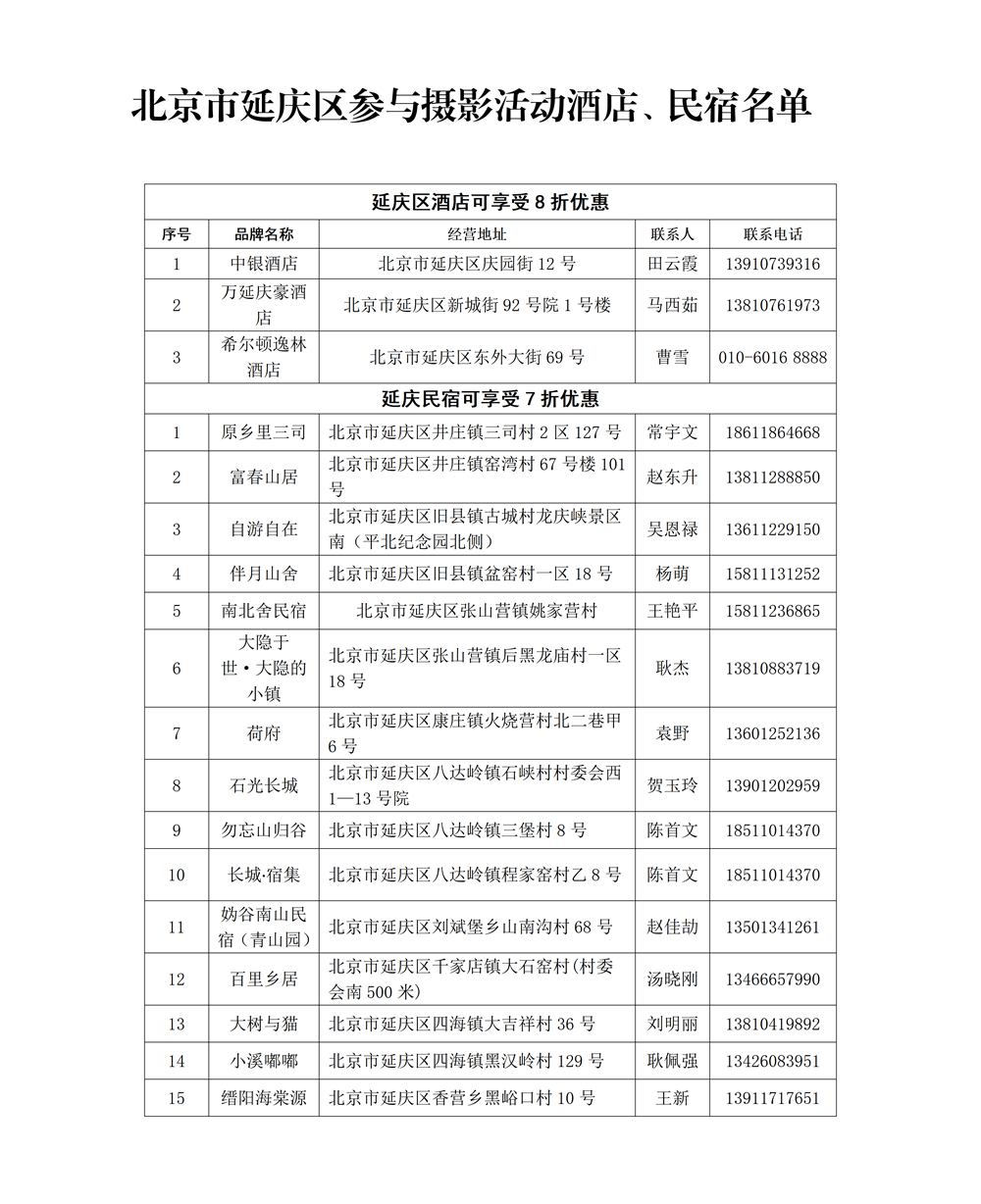 北京市延庆区参与摄影活动景区、餐饮企业及酒店民宿名单